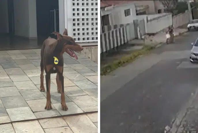 Uma câmera de segurança registrou o momento em que uma motocicleta estaciona em frente à residência de uma família que acaba de estacionar, por volta de 17h30. Um dos ocupantes do veículo invadiu a casa. Logo depois, o animal perseguiu o assaltante e o retirou do local. Nada foi roubado.