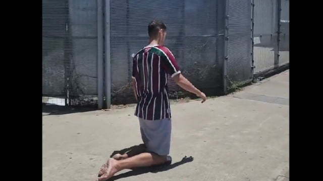 A conta oficial de X do estádio compartilhou imagens de um torcedor que cumpriu a promessa de circundar o reduto… de joelhos. Mesmo com ajuda dos chinelos.