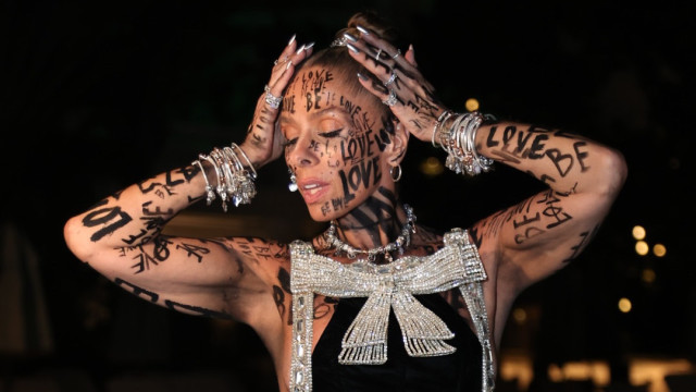 Ela ousou com um maiô simples e tatuagens corporais com a frase “Be Love” (ser amor, em tradução livre). E joias, muitas joias. “O que eu tenho aqui em valor dá para tirar o nome do Serasa”, brincou a apresentadora da Record.