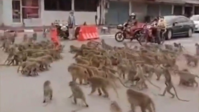 As ruas de Lopburi, na Tailândia, foram invadidas por várias dezenas de macacos que se enfrentaram numa tensa luta territorial.
