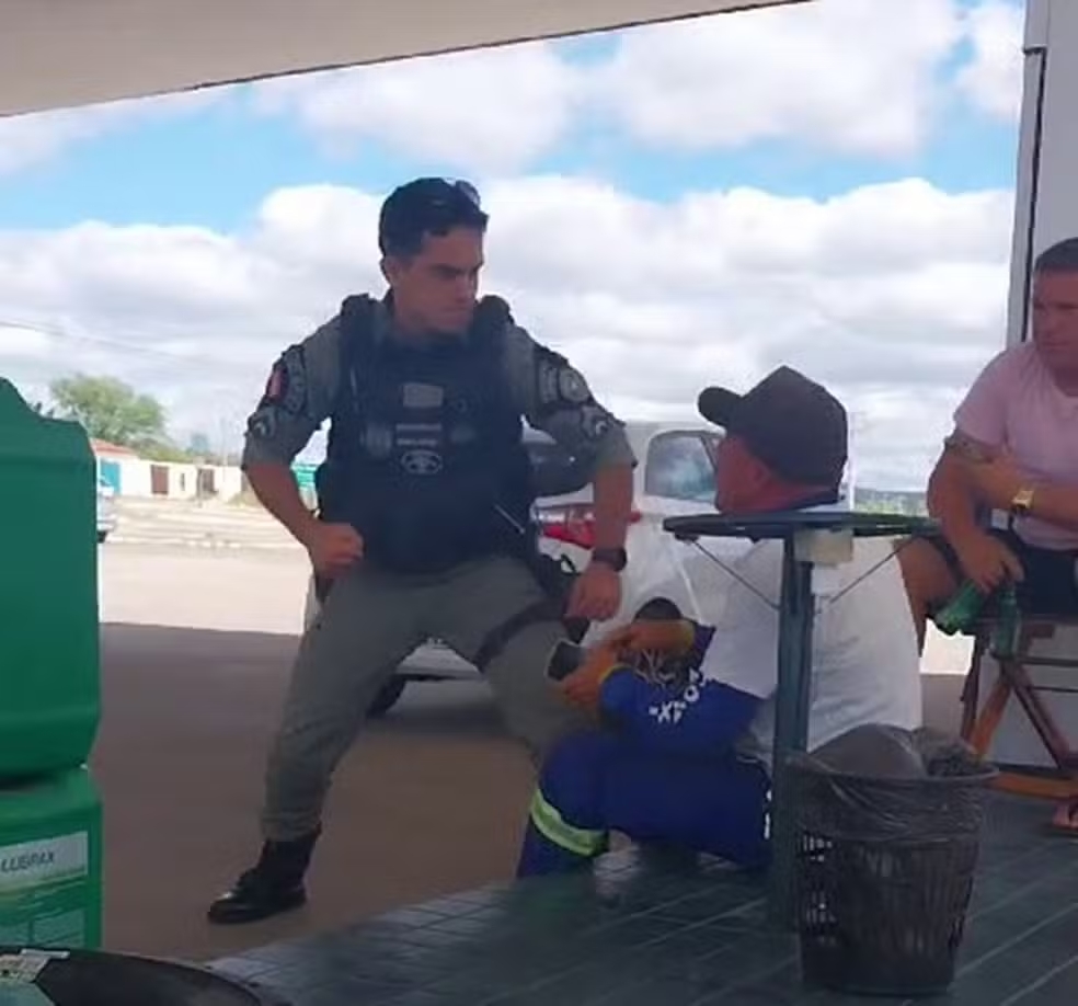 Vídeos que circularam nas redes sociais neste fim de semana registraram o momento em que um policial militar agride um homem em um posto de combustíveis de Santa Luzia, no Sertão da Paraíba. De acordo com os moradores do município, a vítima teria transtornos psicológicos. O policial, que não teve o nome divulgado, foi afastado das funções.