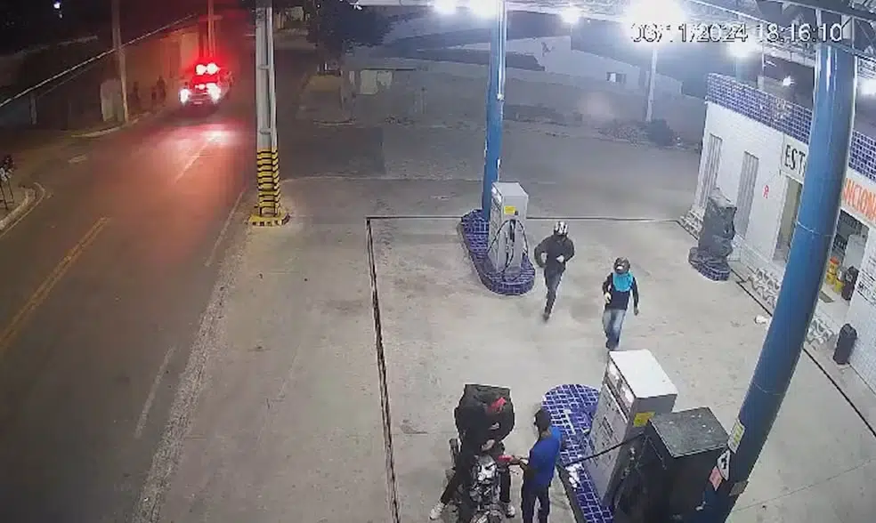 A ação, que aconteceu por volta das 18h, foi gravada a partir de câmeras de um circuito de segurança, mostra que um motoboy estava abastecendo no posto de gasolina, na presença do frentista, quando a dupla de criminosos aparece vindo de uma região atrás do estabelecimento.