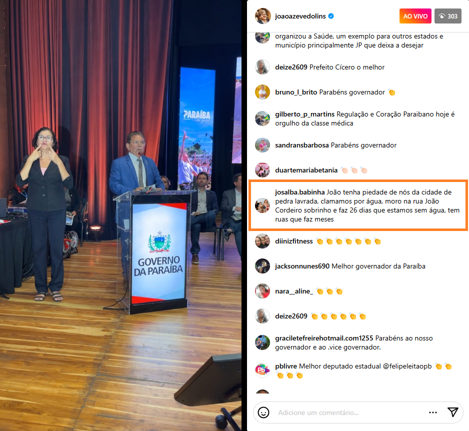 Entre os comentários, @josalba.babinha relatou a situação de desespero enfrentada pelos moradores de Pedra Lavrada: “João, tenha piedade de nós da cidade de Pedra Lavrada. Clamamos por água. Moro na rua João Cordeiro Sobrinho e faz 26 dias que estamos sem água, tem ruas que faz meses.” O relato expõe uma crise de abastecimento que afeta diretamente a população e mostra a realidade dada pelo governo a questões essenciais.