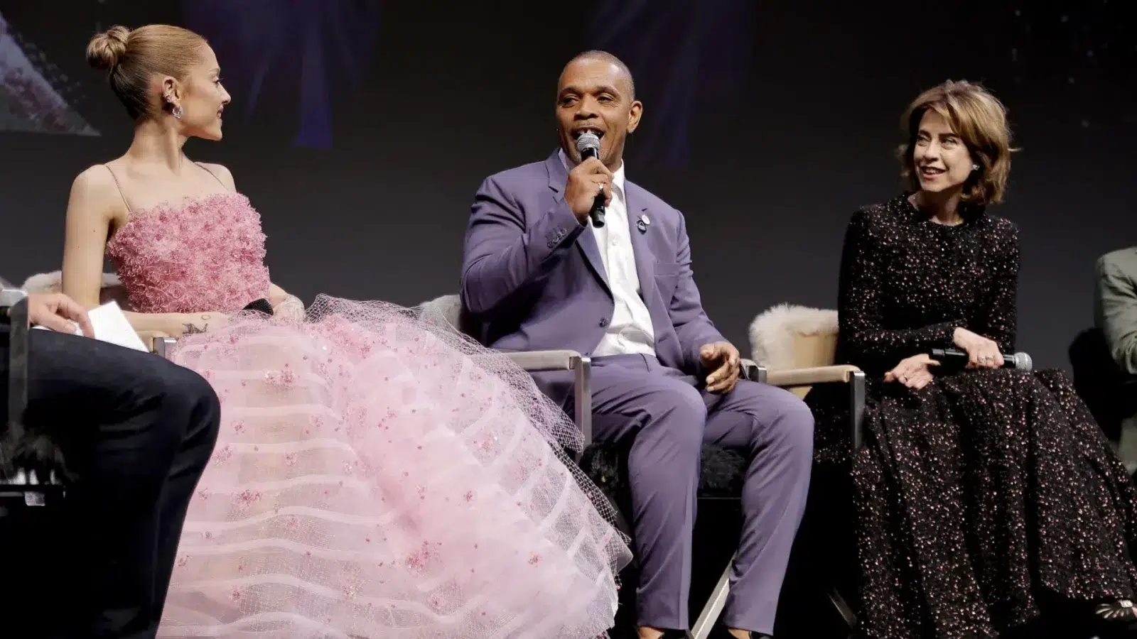 Em seguida, a atriz fez o famoso “toss toss” (balançar os cabelos) da personagem Glinda, interpretada por Grande em “Wicked”. As duas riram e se abraçaram.