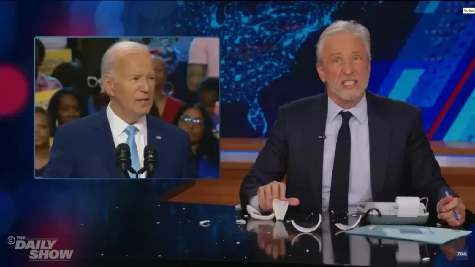 A fúria do âncora ao discursar foi tamanha que ele estilhaçou uma caneca na bancada. Na sequência, Jon olhou rapidamente para a mão ferida, escondeu-a e comentou, em um riso nervoso: “Vou para o hospital em breve”. Mais tarde, porém, ele voltou a levantar o membro e foi possível notar que o mesmo sangrava.