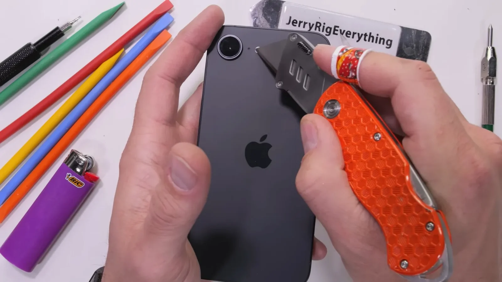 Uma dessas avaliações é do canal JerryRigEverything no YouTube, conhecido por colocar à prova a resistência e durabilidade dos celulares que acabam de chegar ao mercado. O iPhone 16e é o mais recente a ser submetido a este teste, acabando por ter todas as superfícies riscadas, a tela submetida a altas temperaturas e, por fim, até a tentativas de ser quebrado ao meio.