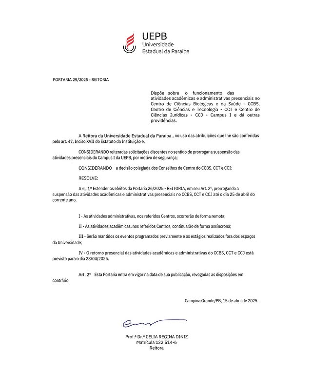 Após intensa mobilização estudantil e a circulação de um abaixo-assinado que pedia a prorrogação da suspensão das atividades presenciais, a Universidade Estadual da Paraíba (UEPB) publicou nesta segunda-feira (15) a Portaria nº 29/2025, que estende até o dia 28 de abril a suspensão das aulas e demais atividades presenciais nos centros CCBS (Centro de Ciências Biológicas e da Saúde), CCT (Centro de Ciências e Tecnologia) e CCJ (Centro de Ciências Jurídicas) do Campus I, em Campina Grande.